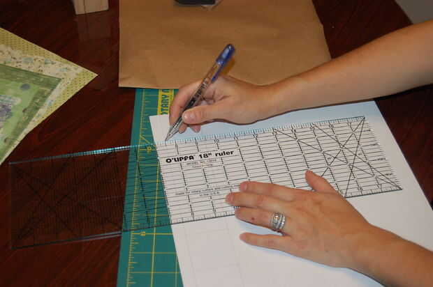 Lápiz en una cuadrícula en la parte posterior del papel scrapbook, más pequeño que sus bloques de 1/4". Estoy usando bloques de 2", así que hice una cuadrícula de 1 3/4" con márgenes de 1/2". Sólo necesito 36 plazas (caras 6 cuadras x 6) y tengo nueve trozos de papel, así que realmente no necesito más de una fila.