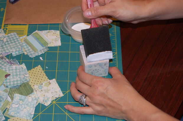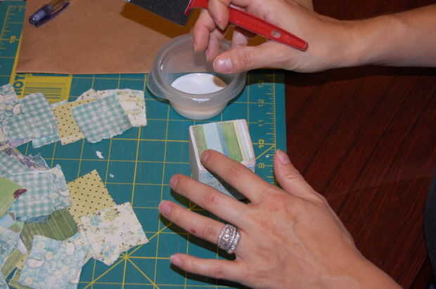 Capa, una cara del bloque con Mod podge. Pegar un cuadrado de papel, acariciando hacia abajo los bordes un poco si es necesario. Cubrir con otra capa de Mod podge. Y continuar hasta que han hecho todos sino un cara. Aquí el término técnico es "decoupage", y si algo parece su tía abuela podría haber hecho hace mucho tiempo, ya que es, y probablemente lo hizo.