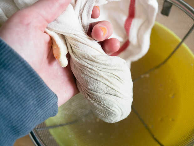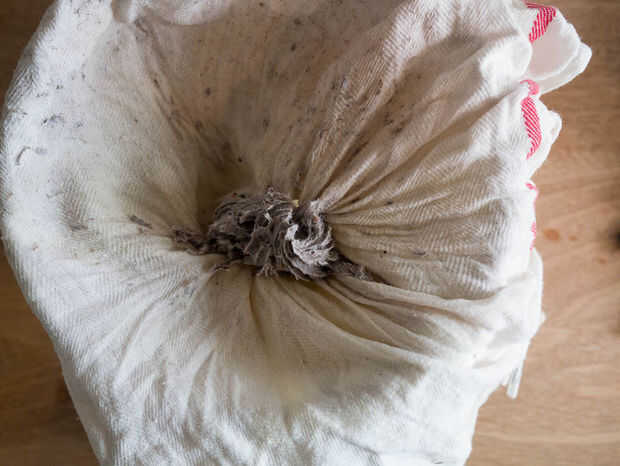 Colar la pulpa a través de un colador de malla fina o una toalla de té. Pongo minas en un tazón separado para reutilizar el agua por lo que puedo crear un segundo lote de bombas de semillas durante el día. Escurra la mezcla de la pulpa en la toalla de té para eliminar el resto del agua para que las semillas no germinan prematuramente.