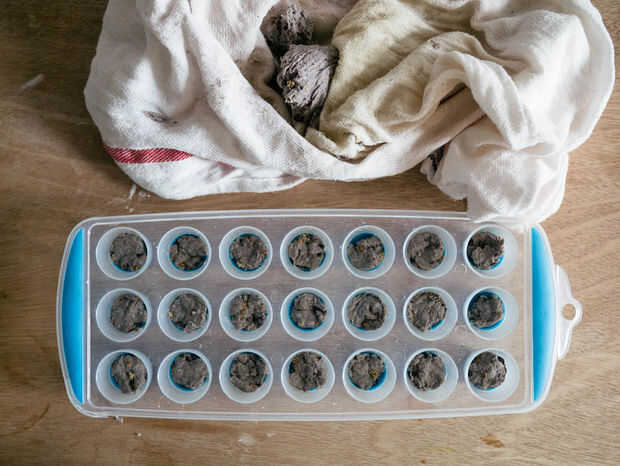 Ahora que tienes tu mezcla de semilla bomba hecha, puede comenzar a formar el sus bombas de semillas. Usted puede hacer este paso con la mano, pero yo prefiero usar un viejo intento de cubo de hielo para hacerlos todos una forma consistente.