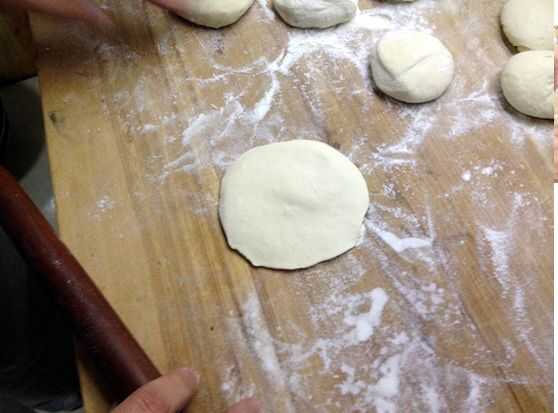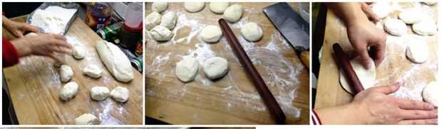 6. Utilice el perno de balanceo para cada masa de harina pequeña en envolturas. (El tamaño es 1/3 pulgadas de espesor y 3,5 pulgadas de diámetro)