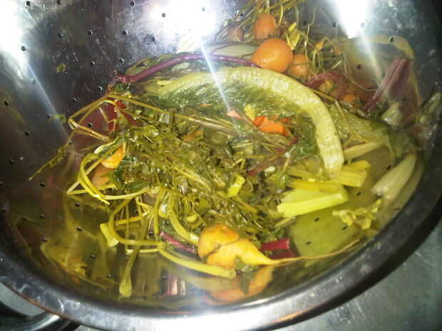 Una vez enfriada la acción tensión quitar todos los vegetales sólidos. (Por esta razón son las verduras en trozos más grandes.)
