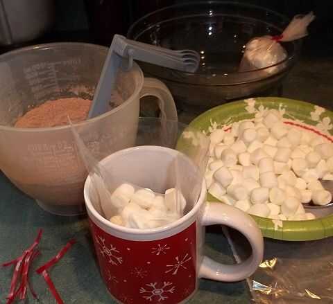 Lugar una bolsa de cono en la Copa y llenar con 4 cucharadas de mezcla de cacao caliente o envolver. Superior con Mini malvaviscos, seguro con ligadura y colocar en posición vertical en un recipiente. Si los ponen el cacao se escapará a través de las nubes y no se ve bien.