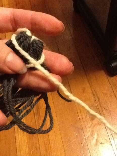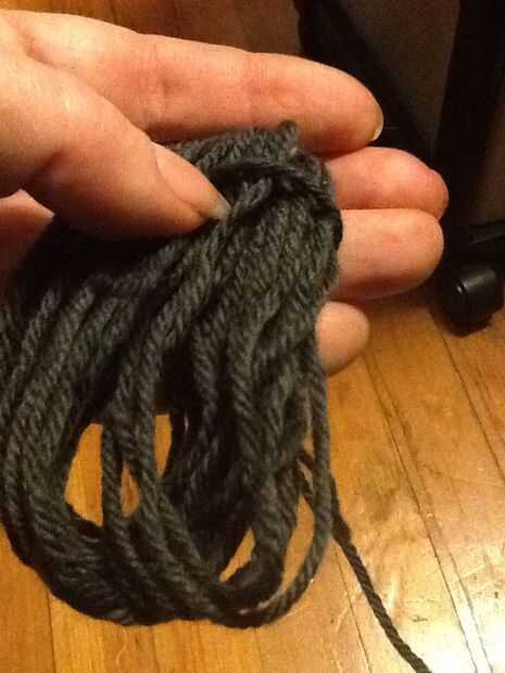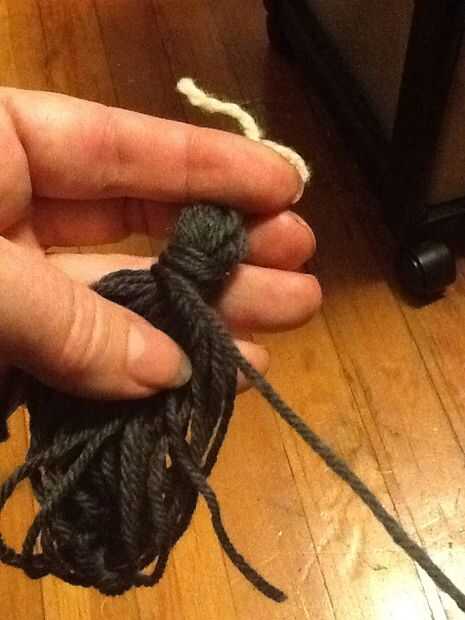 Tomar otra vez la bola de hilo y enrollar varias veces de hilo justo debajo de la atada de extremo, dejando suficiente cantidad del partida final pegarse hacia fuera que usted puede atar los extremos juntos. Estoy mostrando este primer hilo de contraste, por lo que se puede ver (4 fotos) luego repetir y terminar con el color original, por lo que parece justo (7 fotos incluyendo atar apagado).