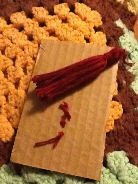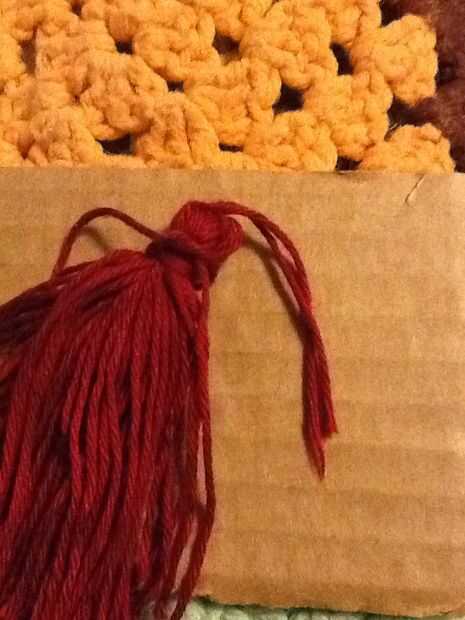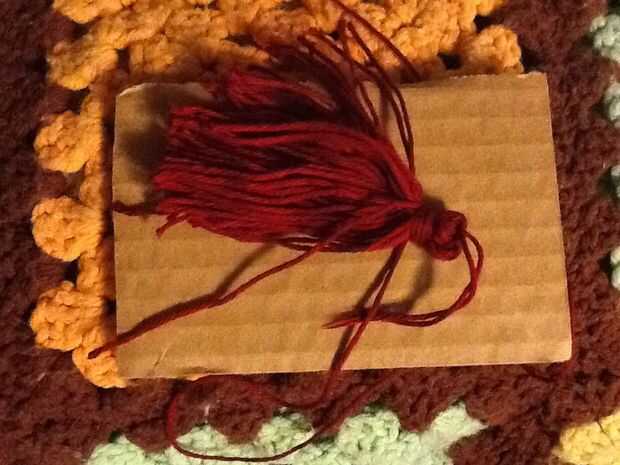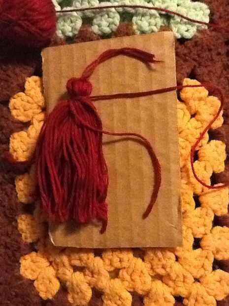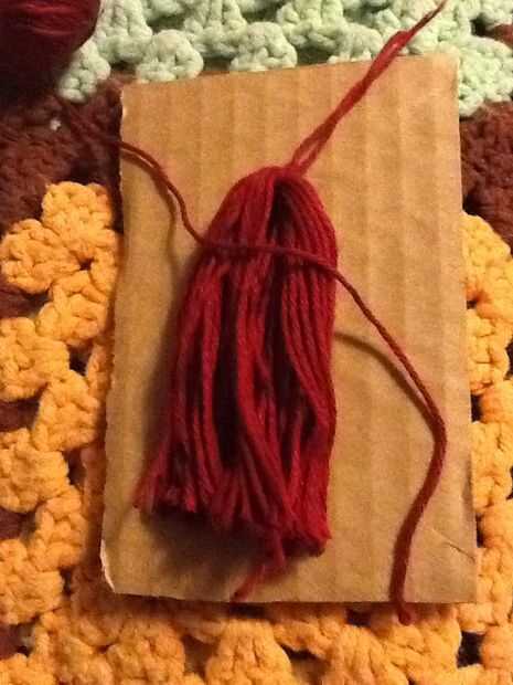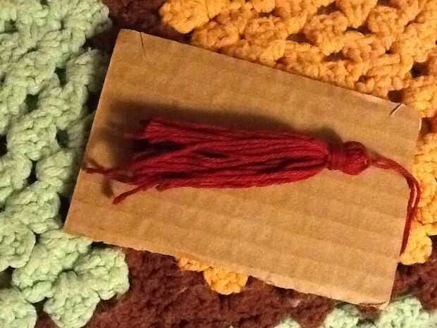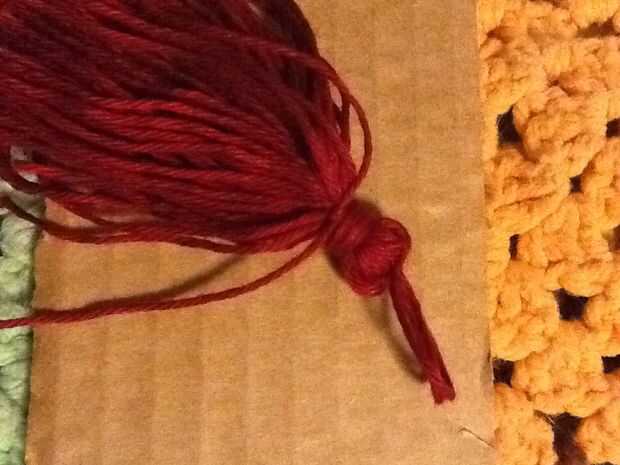 Cortar el hilo de la bola, lo suficiente para empatar con el final comenzó con y colgando sobre tanto tiempo como la borla. Atar firmemente.