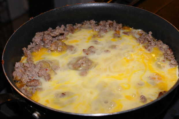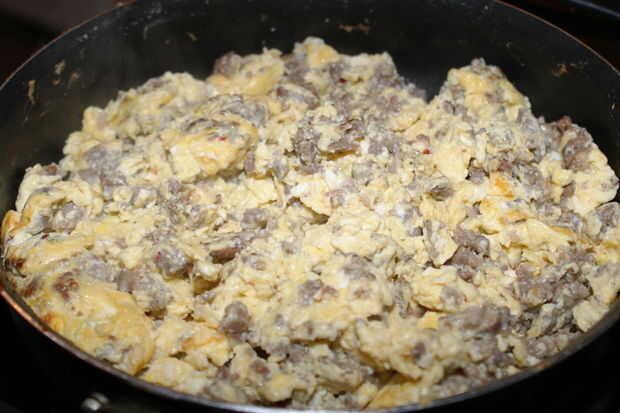 Paso 4:Cook huevos y salchicha hasta que todos los huevos son revueltos y sólida y se ha ido todo rojo en la carne.