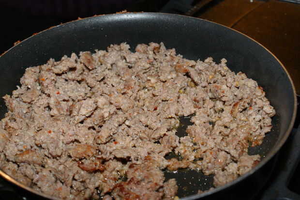 Paso 3:Start salchicha en una sartén de cocina hasta rojo se ha ido luego vierta los huevos.