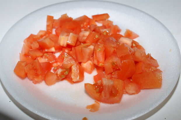 Paso 5:Dice dos tomates para agregar a los huevos (no bien).