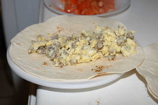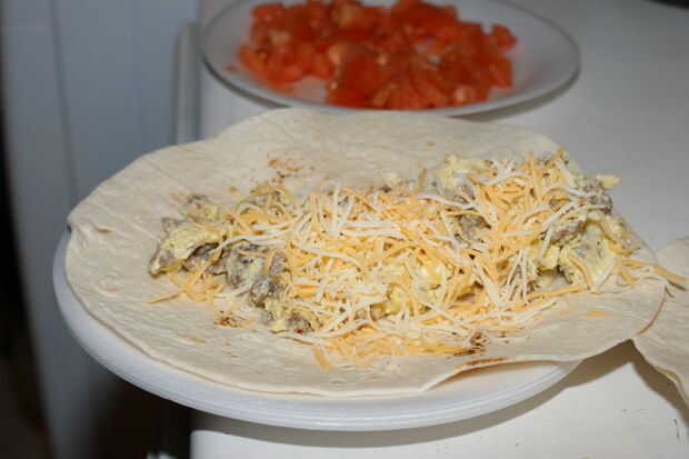 Paso 7:Put los huevos con la tortilla, luego añadir el queso, tomates, salsa picante y nada que te gusta.