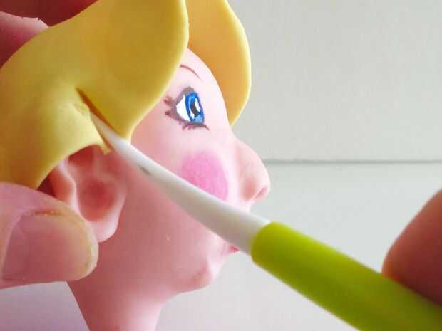 Entonces había cubierto esta pieza sobre la cabeza y utilizar mi herramienta poco texturizado para hacer un corte en el frente de cada oreja, separa una sección para el flequillo y metiendo el resto detrás de la oreja.