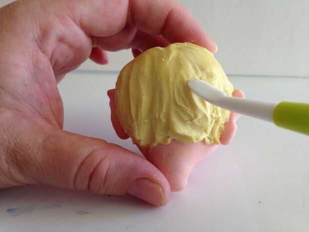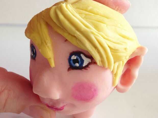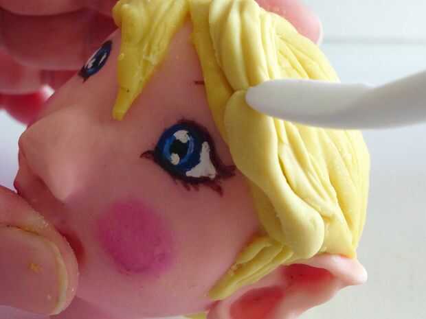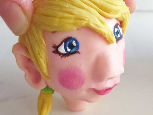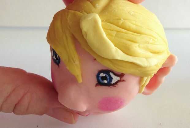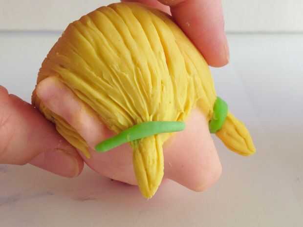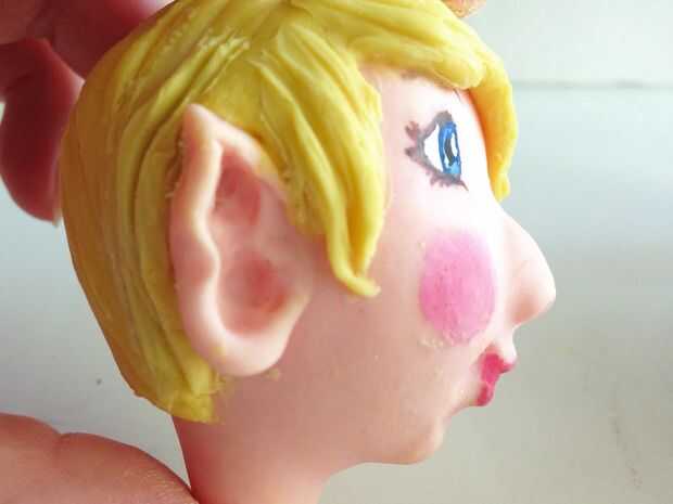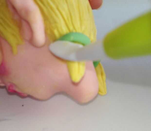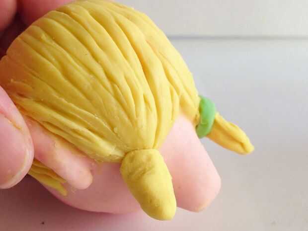 Pude haber parado aquí, pero decidí volver a mi idea de dar sus coletas. Lanzó un pequeño registro de arcilla, había conectado con el resto del cabello y había mezclado. Ahora que mi arcilla fue correctamente hidratado, pegado en su lugar fácilmente sin necesidad de añadir más agua o pegamento. Por último, he añadido algunas bandas de pelo verde para completar el look y darle un poco más de fuerza.