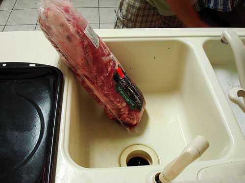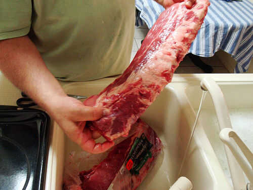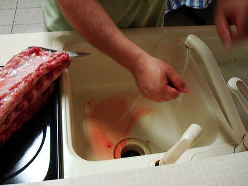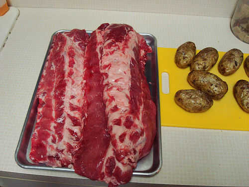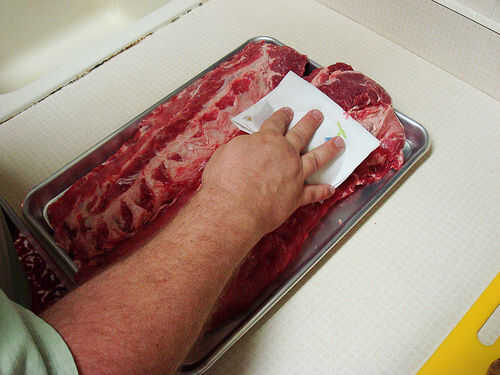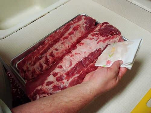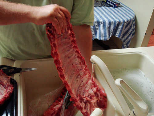 En primer lugar, que desea lavar las costillas y obtener todos los jugos exceso de ellos. De esta forma que no está goteando sangre por todas partes. Luego pat les seco con unas toallas de papel. Puede que necesite hacer sus bastidores en mitad dependiendo del tamaño de su pan y cuántos estantes que estás cocinando.