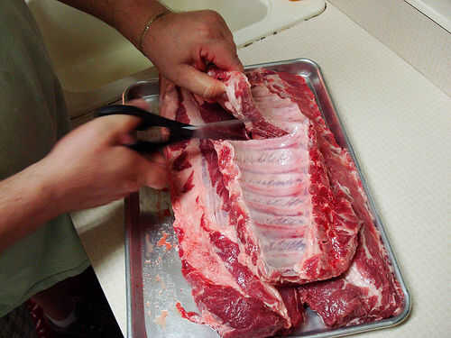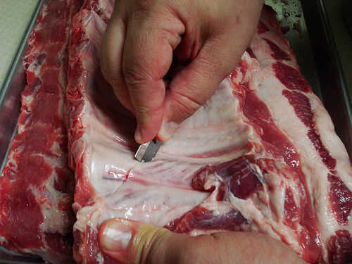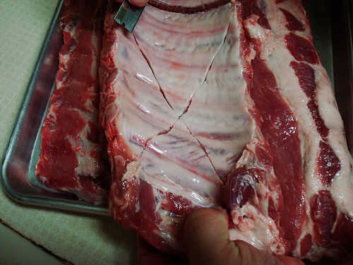 Utilice un cuchillo o navaja para cortar una "X" en el silverskin en la espalda o las costillas. Esto evitará que los que se encrespa para arriba.