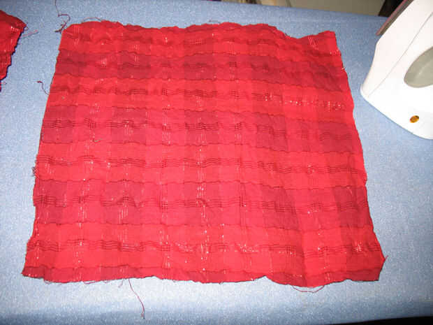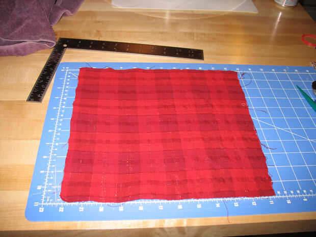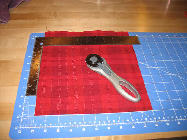 Recortar las piezas en cuadrados. 10 "X 10". Este tamaño será aproximadamente una caja de 4". Puede usar cualquier tamaño. Sólo asegúrese de que su tela es corte cuadrado para este tipo de caja.