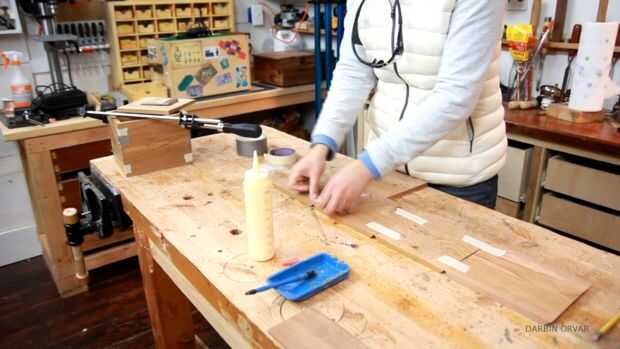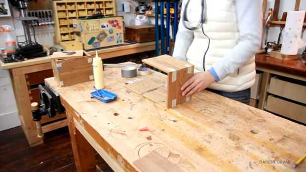 Tiempo para unir las cajas. Estoy usando algunos diurex para asegurar los lados juntos, y luego voltear alrededor, colocar pegamento y plegar el cuadro juntos. Esta técnica funciona muy bien con las esquinas a inglete que pueden ser un poco difíciles de hacer bien. Entonces sólo comprobando cuadrado y repetir con las restantes dos cajas.