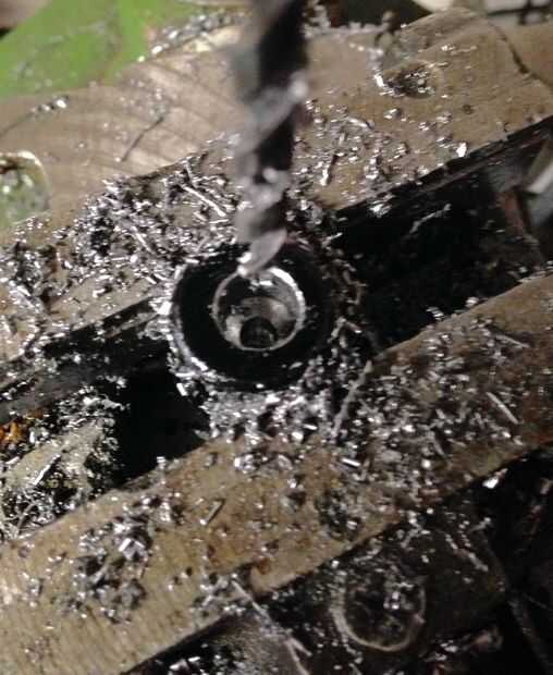 El centro biselado en la parte inferior del agujero de 3/8 de pulgada centra automáticamente un taladro de 3/16 de pulgada. Perforé por el resto de la longitud de la varilla de 3/4 de pulgada con el taladro de 3/16 de pulgada.
