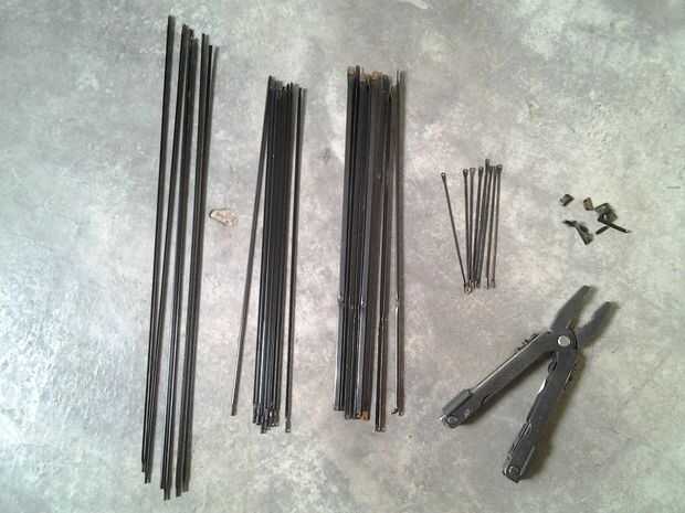 Usted recibirá 3 componentes de las costillas (parte más larga), la camilla (igual que las costillas pero más grueso y más corto) y parte de la camilla, una varilla sólida de acero de pequeño diámetro.
