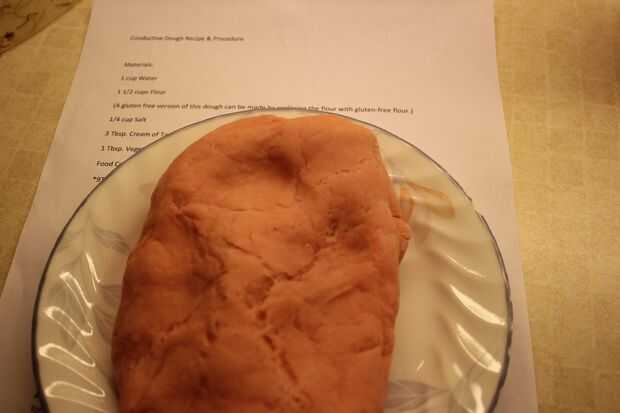 El método de cero implica un montón de harina, aceite y agua para crear dos tipos diferentes de masa - un aislante de masa, con el azúcar y una masa conductora, con la sal. Para hacer la cantidad de masa que lo necesario para una sesión de capacitación para bibliotecarios de 30 a 40 tomó algún tiempo, y los resultados fueron inconsistentes - como hacer la masa a menudo es - y la arcilla varía de lote a lote, a pesar de nuestros esfuerzos.