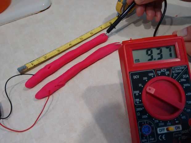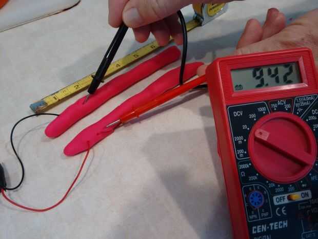 Pero, ¿cómo se comporta el voltaje? Para comprobar caída de tensión, había enrollado dos 6 pulgadas Play Doh cuerdas, había energizado con una batería de 9V y comprobar la tensión en 1/2 pulgada de donde el voltaje de la batería entra la arcilla vs 6 pulgadas de distancia. Una vez más, la diferencia fue realmente insignificante para proyectos típicos blando. En la marca de ½" mide 9.43V (típico para una batería de 9V) y 6" lejos era sólo 9.37V.