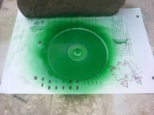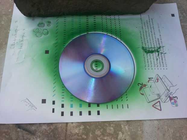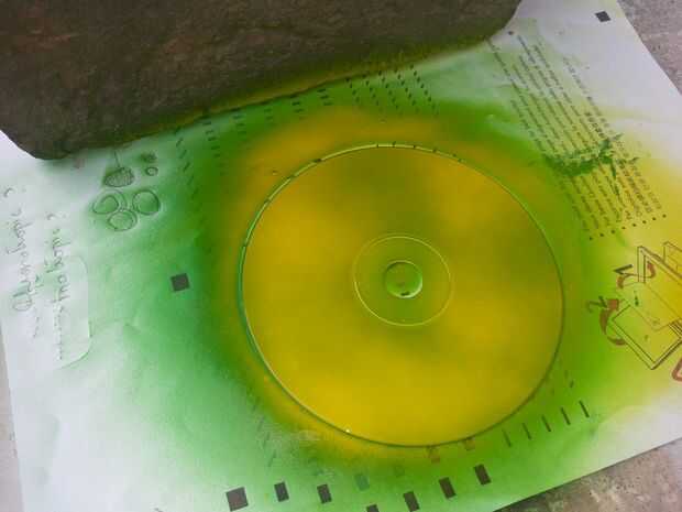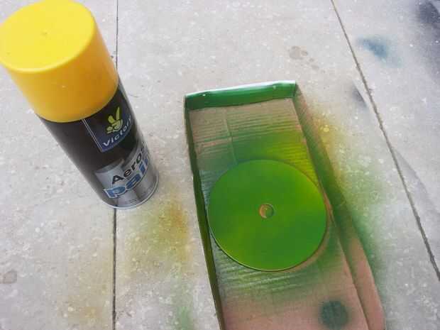 Limpie la superficie a ser pintada con una almohadilla para fregar. Pone áspera la superficie ayudando un poco a la pintura se adhiera correctamente. Rocíe los Cds en el color deseado. Puede agregar textura rociando ligeramente con otro color sobre el color base. Si quiere conservarlas los datos en el cd tenga cuidado de no rociar sobre los datos que contiene el lado.
