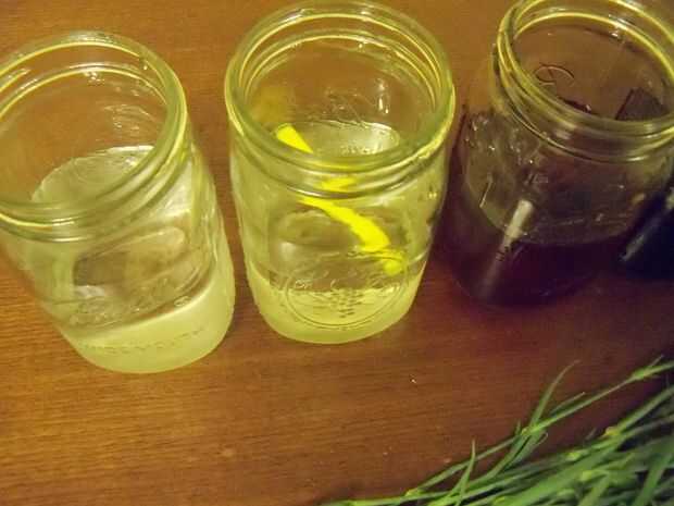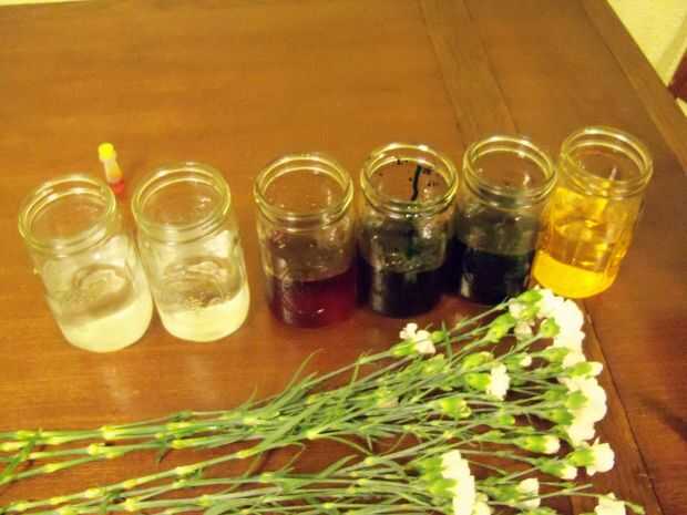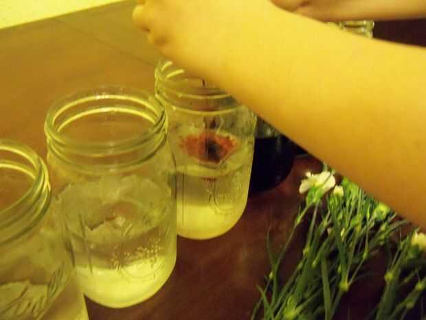 Llene cada uno de los contenedores cerca de la mitad llena de agua. Colorante líquido generalmente viene en un paquete de rojo, azul, verde y amarillo, por lo que en el apretón de cuatro primeros frascos una generosa cantidad de cada color--sobre todo amarillo, generalmente es de claro. Compré un paquete de colorante solo para ello, usé el recipiente entero.