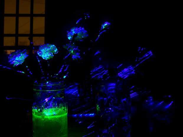 Como esto va en nuestro experimento durante un día o dos, el agua colorido nueva es levantado en la parte superior de las flores. Se puede ver en ella las flores, también en las puntas de las hojas y en las articulaciones de las flores del cordón. La primera imagen es la flor en el agua marcador fluorescentes bajo luz UV. Realmente se puede ver la tinta fluorescente en los pétalos, así como las uniones de los tallos.