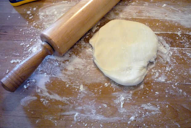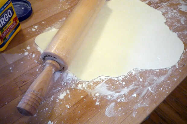 Pulse la bola plana y añadir más maicena... luego estirar a aproximadamente 1/8" de espesor.