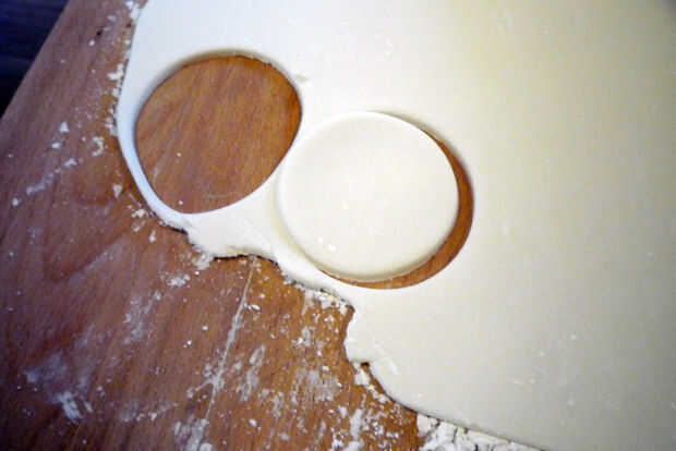 Con una de 2" a 2-1/4" cortador de galletas (yo usé una vieja taza de medida) corte a 12 asaltos. (Foto 3)
