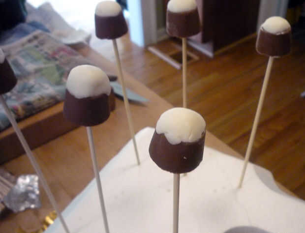 Nota: Tenga cuidado! Sólo pulse el pincho lo suficiente para sostener el rolo recta. Si usted consigue el pincho demasiado cerca a la cima del rolo, trabajará tiempo de paso por el chocolate en la parte superior de la cabeza como ella se calentara más.