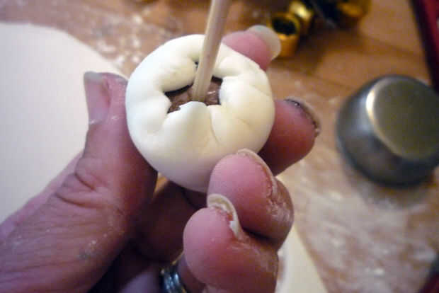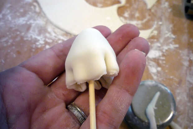 Nota: algunas de mis primeras, el fondant era tal vez un poco más delgado y más flexible, y sólo arrancaron los extremos (ver foto 3). Esto funcionó demasiado, pero tienes que tener cuidado que no rasgue demasiado corto.