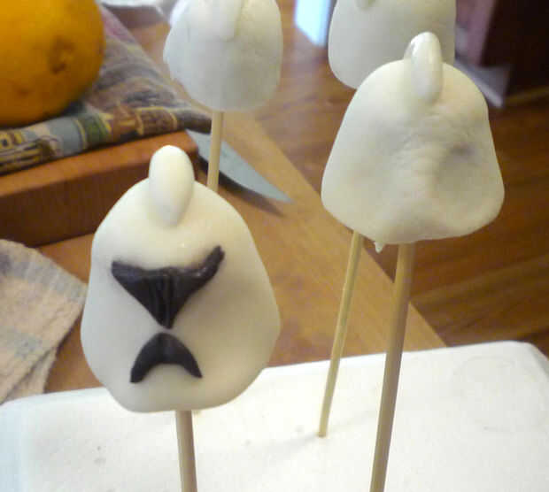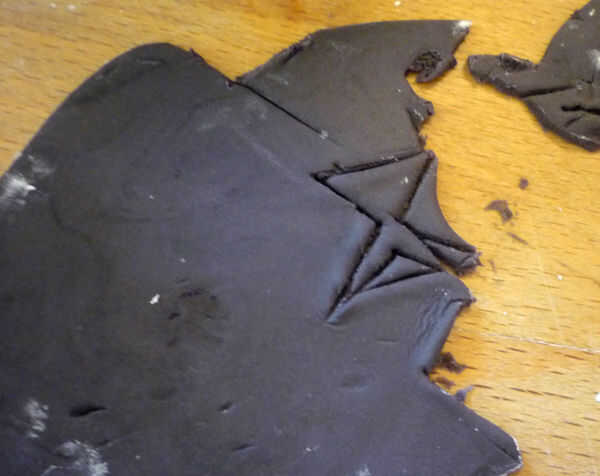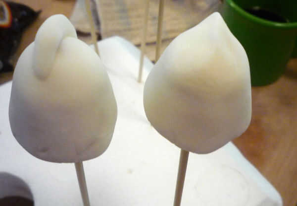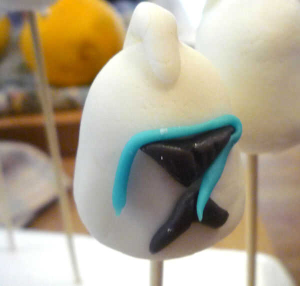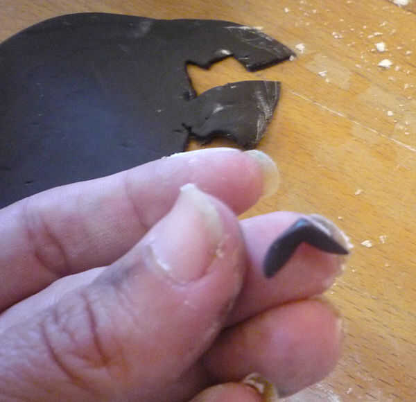 1. negro: Recortar un triángulo para los ojos. Humedecer la parte posterior de la pasta de azúcar con agua y pulse. Hacer una pequeña serpiente de la boca y doblar por la mitad a un punto (ver fotos). Presione por debajo del punto de los ojos, punto a punto. Utilice un palillo de dientes para presionar juntos si es necesario.