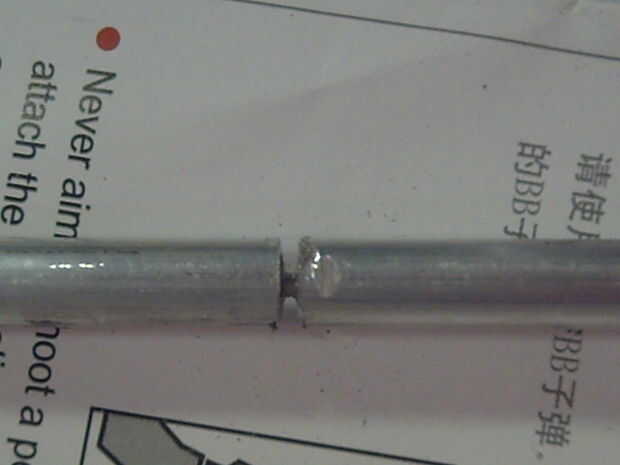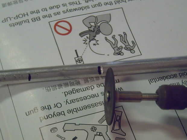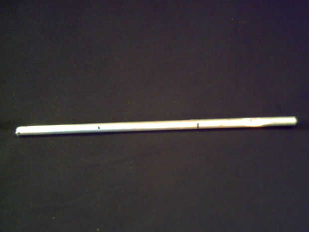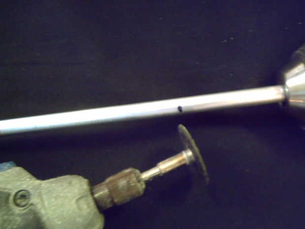En primer lugar, Mida hacia abajo desde un extremo de la varilla de 1 1/4" y marcar con el marcador. Luego, Mida hacia abajo 1 1/2" de esa marca y marca otra vez. Luego marque 2 1/4" pulgadas de eso, y lo mismo. Una vez más, la marca 2 3/4" fron que marque y haga una marca. En la marca usted acaba de hacer, cortar a través de todo el camino con la herramienta Dremel, con la rueda de corte. Ponga la sección sin marcar a un lado.