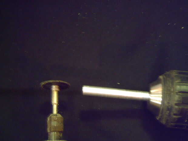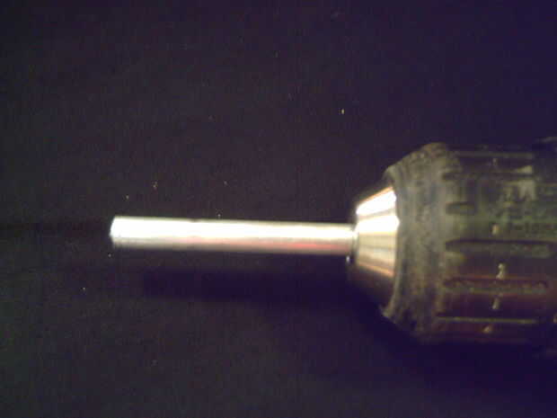 En primer lugar, conseguir la varilla más larga y apretar en el taladro, con la parte que sobresale del extremo de th (fig. 2). El gatillo, que hará girar la varilla y pulsa el papel de lija contra la varilla, haciendo que las fracciones de la barra de una pulgada más pequeña y también de pulido. Luego tomar el botón de perforación en un lado y la Dremel en el otro y encienda el Dremel. Comenzar a girar el taladro con te de otra mano y presionar sobre la protuberancia de la colada-como en el extremo de la varilla (ver figura 1). Este afile y aplanar el extremo mediante el uso de esta técnica. En este extremo y - sólo - en esta barra (uno más largo) sostenga la parte superior de la corte fuera rueda en aproximadamente un ángulo de 45 grados a la barra y un ángulo en la barra de corte (ver fig. 3). Este pisón se utilizará solamente para la arcilla, para formar un embudo para el caliente gases/llama. Ahora, arena esto otra vez, a conseguido un acabado decente, no tiene que ser perfecto.