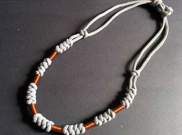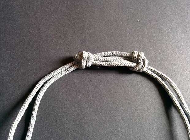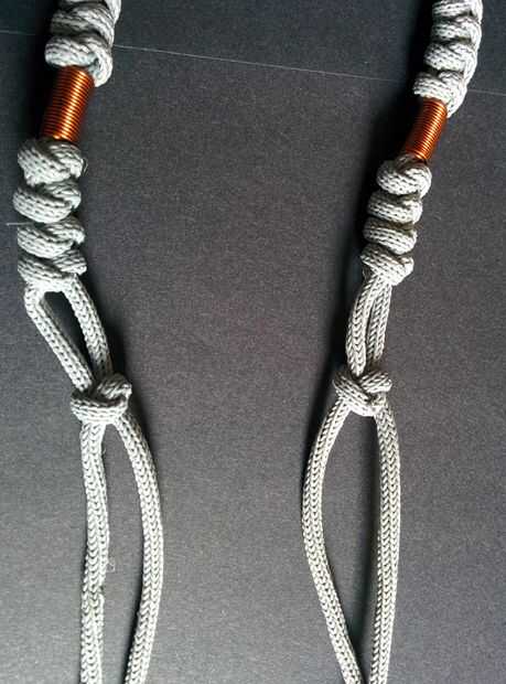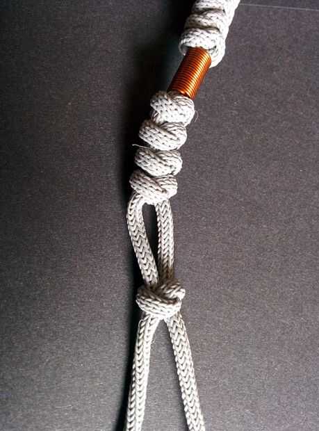 - Una vez que haya terminado de tejer, sostenga las cuerdas con el pulgar y el dedo índice, deje un espacio y un nudo serpiente solo como se describe en el paso anterior.