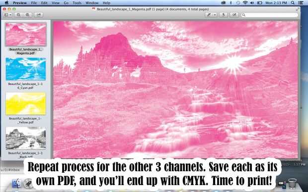 Cada color está ahora en su propio documento, pero aparecen en blanco y negro. Donde la parte de la imagen que tiene una cantidad pesada de ese tipo de tinta es representada como negro. Vamos a cambiar a sus colores.