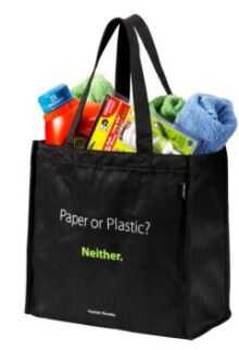 Cuando se le preguntó si prefiere papel o plástico... decir "No". Eso es porque tienes tus propias bolsas reutilizables. Puede obtener bolsas reutilizables en cualquier lugar de $0 a más de $100. Sugiero que ir de los más baratos. En LA y probablemente un montón de otros lugares, algunas tiendas le dará un reembolso de $0,05 por cada bolsa reutilizable que utilizas. Las bolsas se pagan después de algunas visitas.