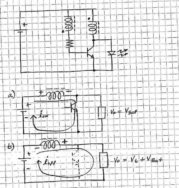 Cuando el transistor conduce, los flujos actuales a través de L1 y el LED está apagado (fig. a). Esto crea un campo magnético en la bobina y hace L2 apaga el transistor. Cuando esto ocurre (fig. b), la energía del campo magnético induce un voltaje en la bobina del llamado "back emf" y esta agrega para arriba con la batería para que tenga 3 V o más (es como agregar las baterías en serie).
