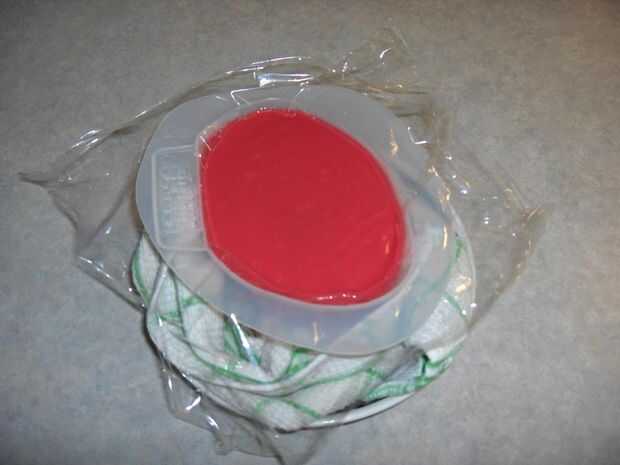 Si es así, retirar de la nevera, cortar cualquier exceso bolsa "cola" de la bolsa de sangre y colocar cuidadosamente en el centro del molde, sobre la capa de arriba firme que hemos vertidos anteriormente.