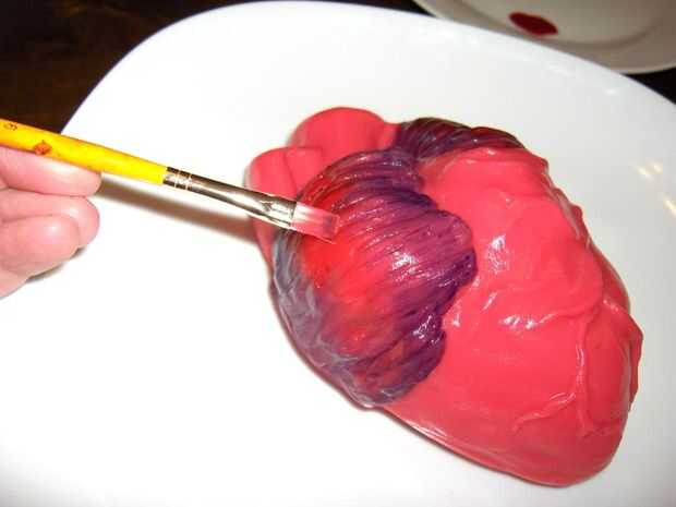 Ahora repase cada vena con rojo. Poco debe hacerlo. Color de algunas partes de la superficie del corazón con un poco de rojo también a resaltar el color.