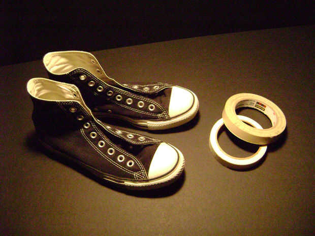 Cinta - cualquier tipo va a hacer si tienes suficiente. Estoy usando cinta adhesiva. Este instructivo está hecho para el evento inesperado de un cordón roto, así que no esperes la cinta de enmascarar para que dure más de un día o dos. Cintas de plástico son un poco más durables, con conducto y cinta aislante, siendo el más duradero.