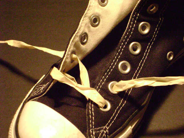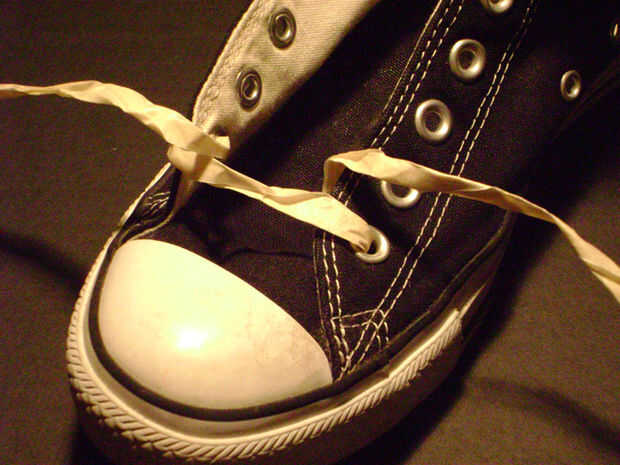 Luego cruzan los dos extremos a través de la segunda serie de ojales aunque de adentro hacia afuera. Continúe este patrón entrecruzado hasta el último conjunto de agujeros