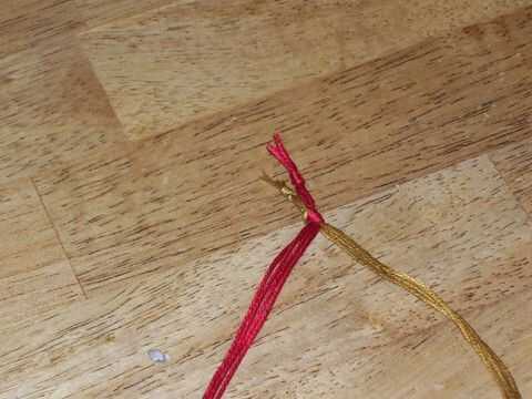 Unir los dos colores en un extremo, manteniendo los otros extremos aparte. Utilice un buen nudo resistente. Ahora usted tiene un cable muy largo que se ata en el centro.