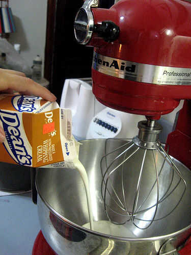 Verter crema de leche en el recipiente de una batidora. Si no tienes una batidora, una batidora de mano funciona así. La batidora a una kitchenAid batidora es ideal!