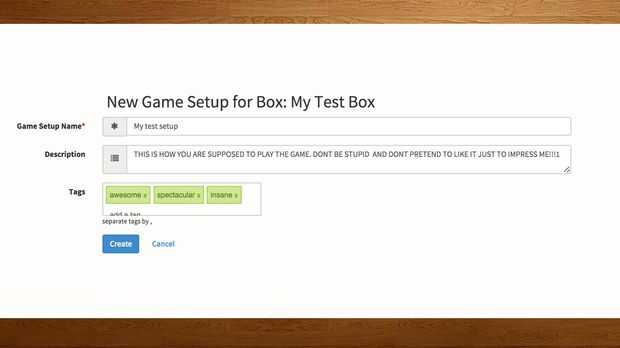 Hemos llegado a la forma para crear una nueva configuración. Introduzca un nombre único para la configuración que debe de alguna manera decirle a los jugadores qué tipo de configuración este es (por ejemplo mis ovejas cargado isla de Catan)