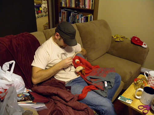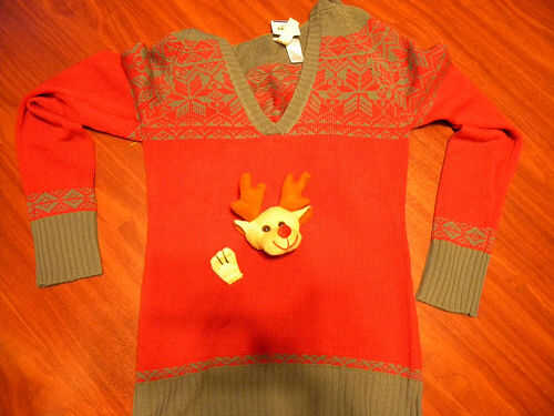 Cortar extremidades y la cabeza del peluche. Más juguetes de peluche de tipo Beanie Baby tienen fibra en la cabeza e incluso en algunos miembros por lo que su suéter todavía será ligero. Experimentar un poco con la colocación de las partes del cuerpo. Encontré que trabajaron mejor en el estómago de la chompa.