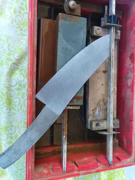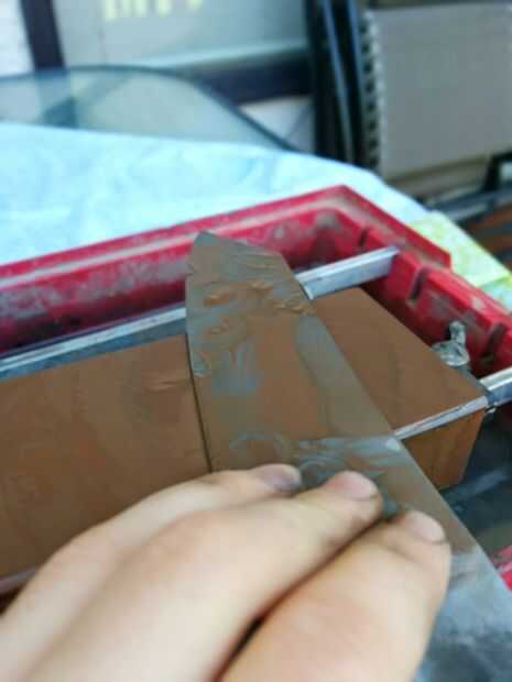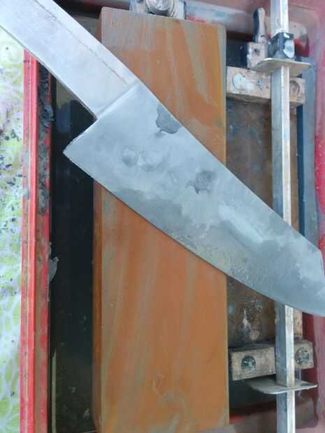 El proceso es simple solo frotar la hoja sobre las piedras, o frotar la lija sobre la hoja. Hacer esto hasta que toda la superficie es áspera uniformemente fina y luego subir un nivel en la arena. Si usted está usando piedra yo sugeriría mantener la cuchilla en la última pulgada o dos de las piedras, esto ayudará a mantienen nivel. Mantenga alternando que lado le está haciendo no dejando a un lado o el otro mojado y en el aire pues muy largo, si usas wetstones. Si usas piedras que pueden aceptar aceite entonces recomiendo usarlo como evitará manchas. Esto le llevará mucho tiempo, pero no como configuración de la rutina.