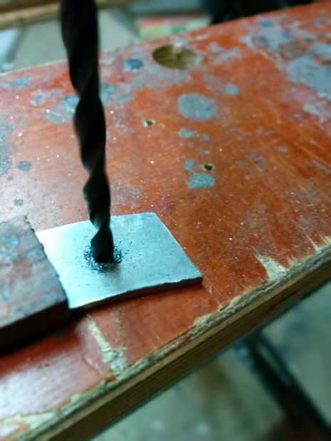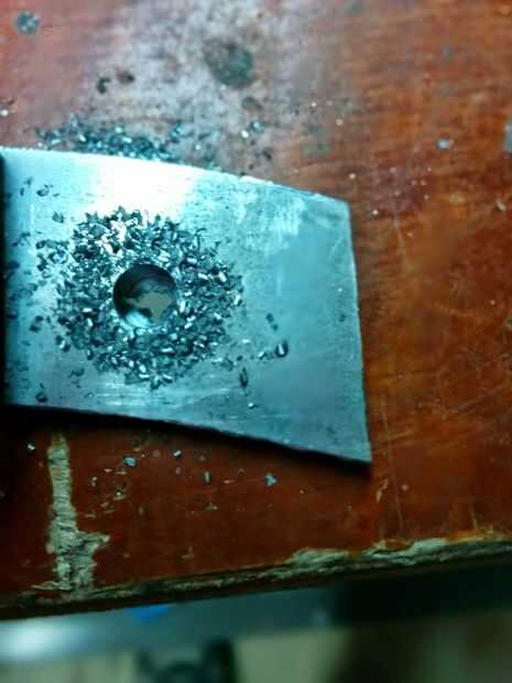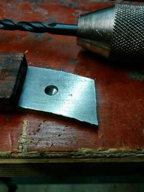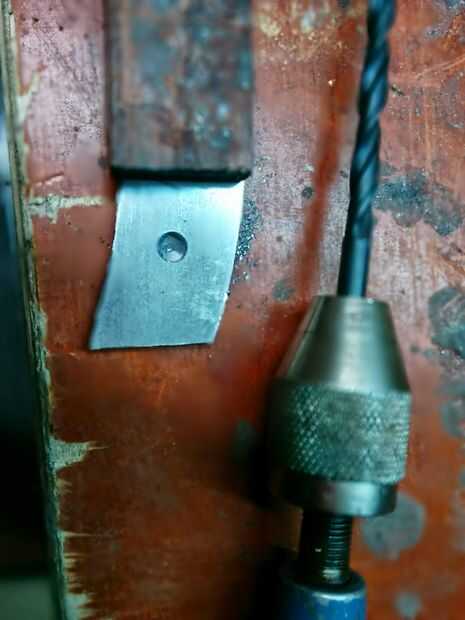 Para unir el asa escala a su cuchillo que tendrá que tienen dos agujeros perforados en la espiga para poner los remaches a través. Es importante hacerlo ahora, antes del convite de calor. Te sugiero armar un remache de prueba para ver cuánto ampliará cuando se juntan las dos piezas. Asegúrese de utilizar un punzón para sangrar el metal, esto ayudará a detener el pedacito de taladro de errante y lo ayudará a morder el acero. Luego seleccione una broca que sea del mismo tamaño y haga dos orificios en el tang(handle) de la cuchilla. Usando un taladro de mano reduce el riesgo de rotura de brocas. Usé un taladro eléctrico y rompió dos pedacitos de metal diferentes. El taladro de mano no incluso toma mucho más largo que un eléctrico, tapas de diez minutos.