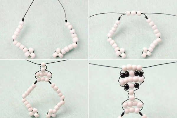 Lo mismo para hacer la otra pierna, cruza ambos extremos a través de 3 cuentas blancas y apriete, seguir a cruzar ambos hilos a través de 4 cuentas blancas, 1 grano blanco, 1white grano, 1 blanco 1 negro 1white granos, 5 cuentas blancas, 2 1Listas negras blancas y 2 cuentas blancas, 4 cuentas blancas en orden, se hace la forma del cuerpo;