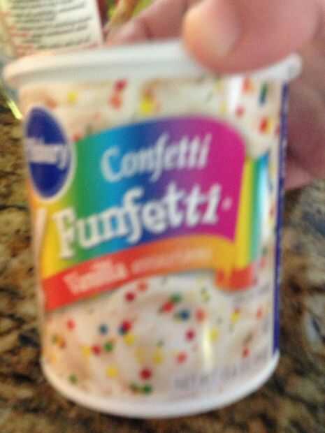 Yummy! La mejor parte... Así que abrir un lata vainillado helar (funfetti era todo lo que tenía, así que sólo tiró el granillo en la parte superior). Sugiero al primer puesto en una o dos gotas de colorante verde. Usted puede hacer un muy ligero verde o puede ser vibrante. Es realmente suya. Como veis, hice mío bastante liviano.