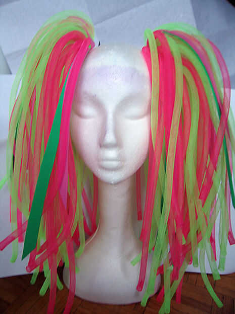 Poner el pelo en dos colas de caballo seguros o bollos, cuanto más alto mejor para obtener un agradable efecto completo y la cobertura de su propio pelo. Atar el cordón elástico o estiramiento firmemente alrededor de su pan; puede ser más fácil hacerlo con la cabeza boca abajo. Utilice algunas horquillas para fijar y listo!